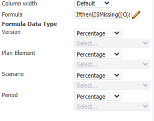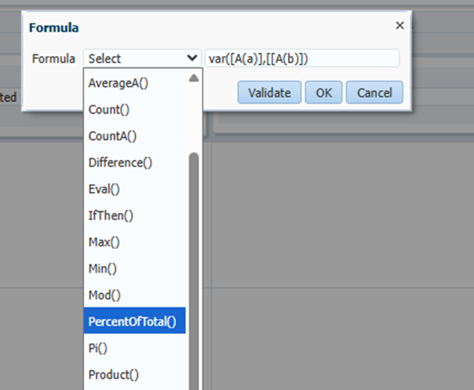 So to check for a zero denominator – Formula: Ifthen(ISMissing([C(a)]),0, Ifthen(ISMissing([A]),0, VarPer([A],[ C(a)])))