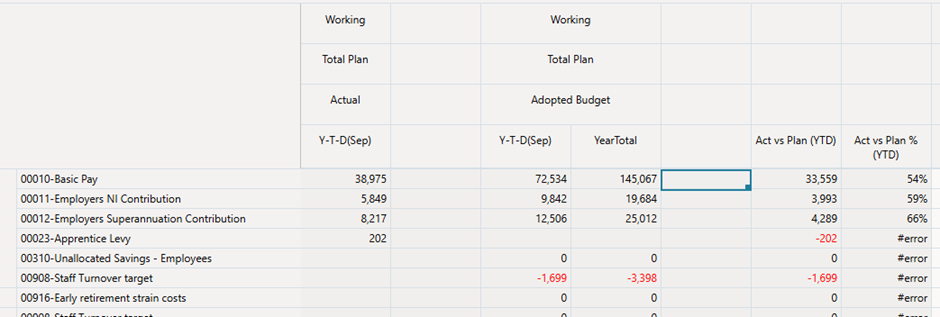 The percent variance “Act vs Plan % (YTD)” – Formula: [A]/[C(a)] is dividing by zero and results in #error